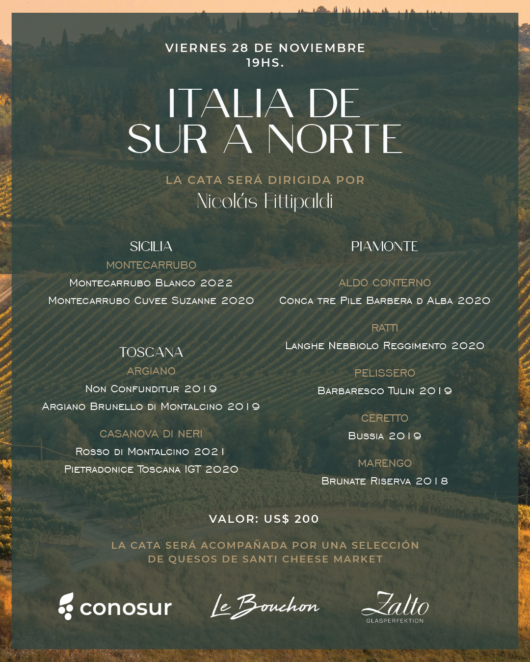 La cata estará acompañada por una selección de quesos de Santi Cheese Market.